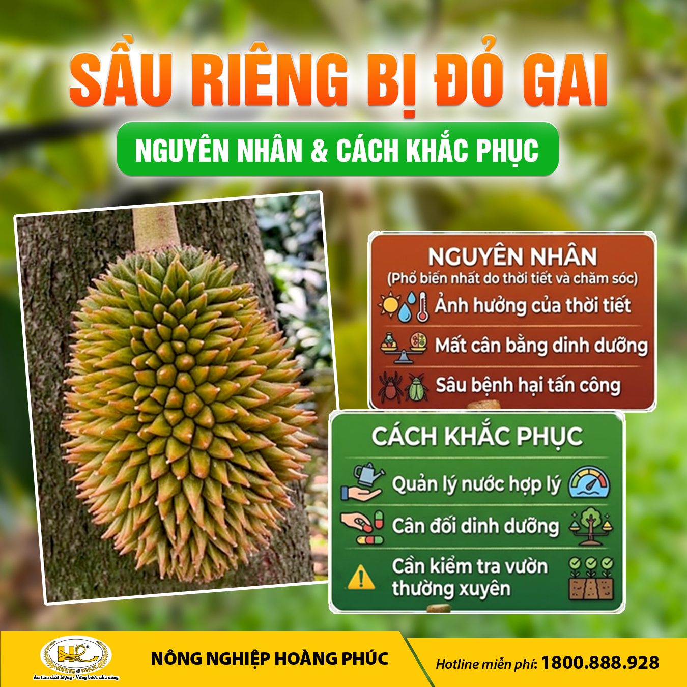 Khi sầu riêng xuất hiện hiện tượng đỏ gai, các kỹ sư của Nông nghiệp Hoàng Phúc cho biết nếu không xử lý kịp thời có thể làm giảm giá trị thương phẩm và ảnh hưởng đến năng suất vườn. Tuy nhiên, đây là tình trạng hoàn toàn có thể kiểm soát nếu nhà vườn hiểu rõ nguyên nhân và áp dụng biện pháp chăm sóc phù hợp. Việc can thiệp đúng thời điểm, kết hợp quản lý dinh dưỡng và môi trường vườn sẽ giúp trái phát triển ổn định, gai xanh đẹp và đồng đều hơn.