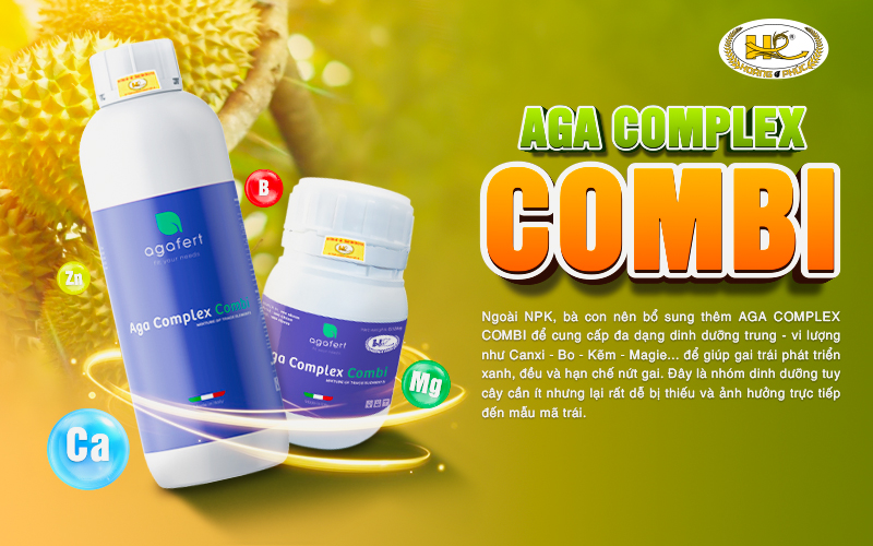 ✔️ Cân đối dinh dưỡng: ngoài NPK, bà con nên bổ sung thêm AGA COMPLEX COMBI để cung cấp đa dạng dinh dưỡng trung - vi lượng như Canxi – Bo – Kẽm – Magie,.. để giúp gai trái phát triển xanh, đều và hạn chế nứt gai. Đây là nhóm dinh dưỡng tuy cây cần ít nhưng lại rất dễ bị thiếu và ảnh hưởng trực tiếp đến mẫu mã trái.